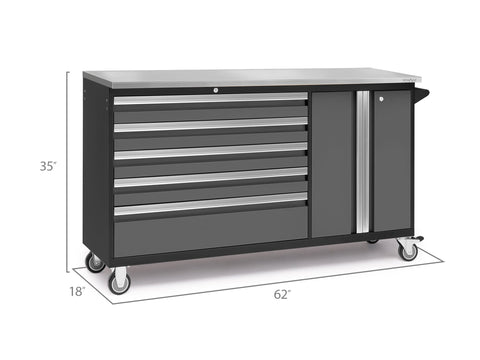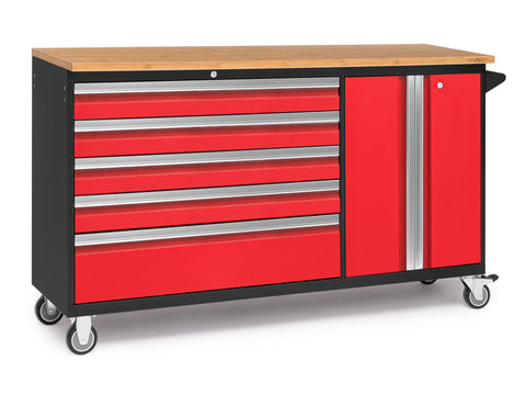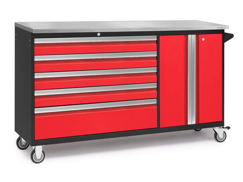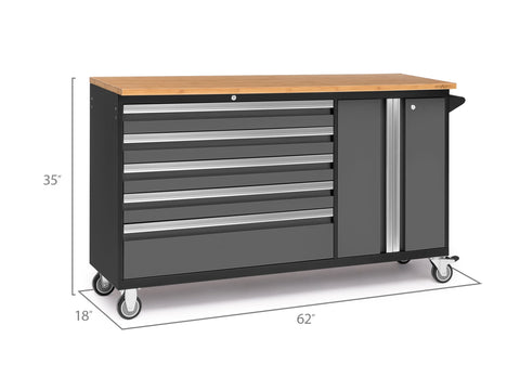 Start your next home improvement project off right, with a mobile storage center capable of holding all your power tools, hardware and accessories. The Bold Series Project Center is a fully lockable workstation that lets you get more done, whether you’re into arts and crafts, or DIY renovations, you’ll have more than enough storage space to keep all your essentials organized and close at hand. The five full-extension drawers provide easy access to tools and parts while working on the spacious bamboo or stainless steel worktop, and the storage cabinet includes one adjustable steel shelf for locking away your larger gear at the end of the day. Smooth gliding caster wheels and an easy-grab side handle that can be installed on either end of the Project Center lets you roll your workstation to wherever you need it, and the two lockable swivel casters secure it in place while working. Full length aluminum handles and a sleek durable paint finish give you that pro look, while protecting from scratches and scuffs. Get organized with the only mobile workstation you’ll need; the Bold Series Project Center.